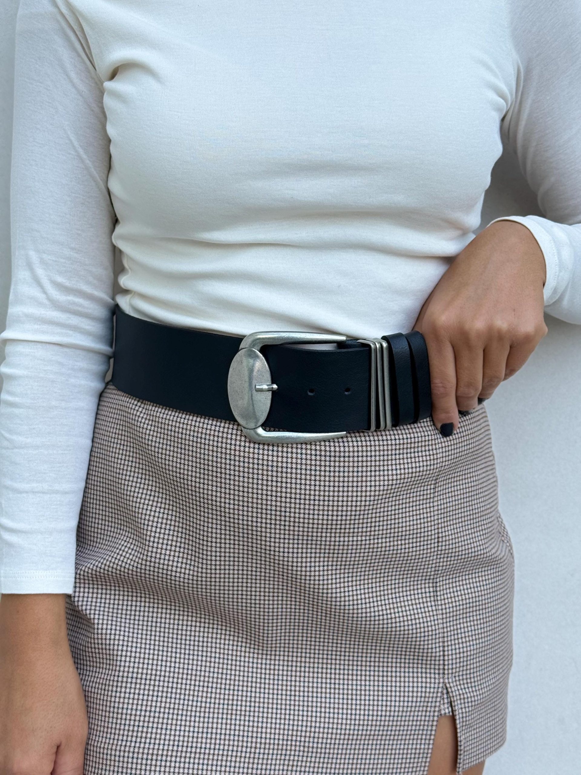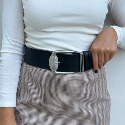 This handmade women s leather belt is crafted from genuine black leather and features a wide 5 cm design. The statement silver buckle and three silver loops add a bold, elegant touch. Designed by our, it s available in eight sizes to perfectly match your style and fit.
